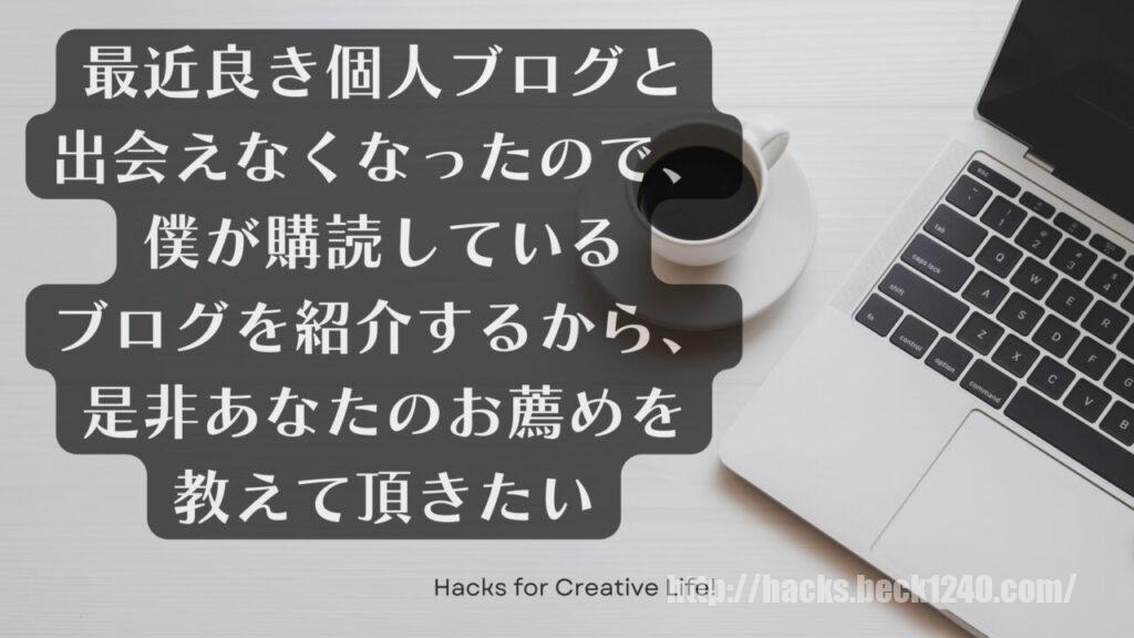 記事なりツイートなりで教えて頂く際には「@beck1240」にメンション頂くか「#私のお薦めブログ」を付けて頂くと取り漏らしがなくなると思います。